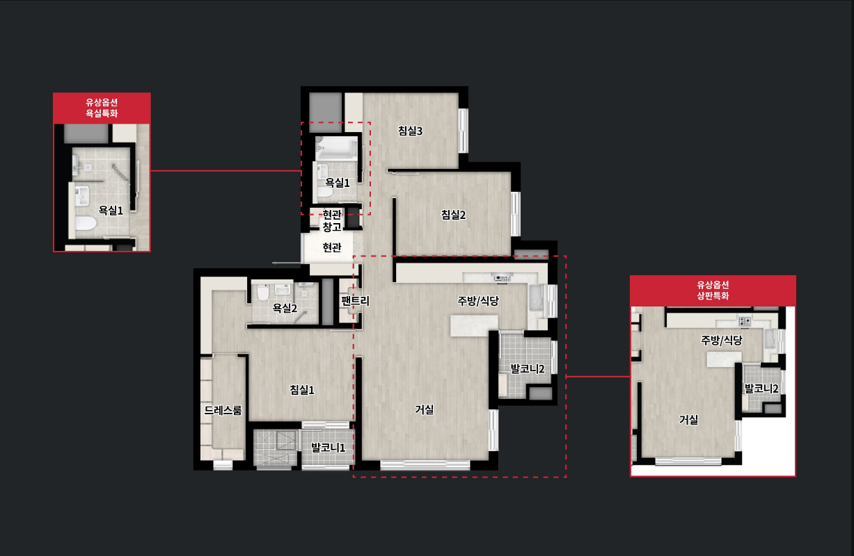 - 110㎡ 타입: 11자형 대면형 주방 설계로 요리 중에도 가족과 자연스럽게 소통할 수 있는 구조입니다. 대형 드레스룸과 넓은 팬트리 공간은 물론, 복도에도 수납공간을 추가하여 넉넉한 공간 활용을 제공합니다.