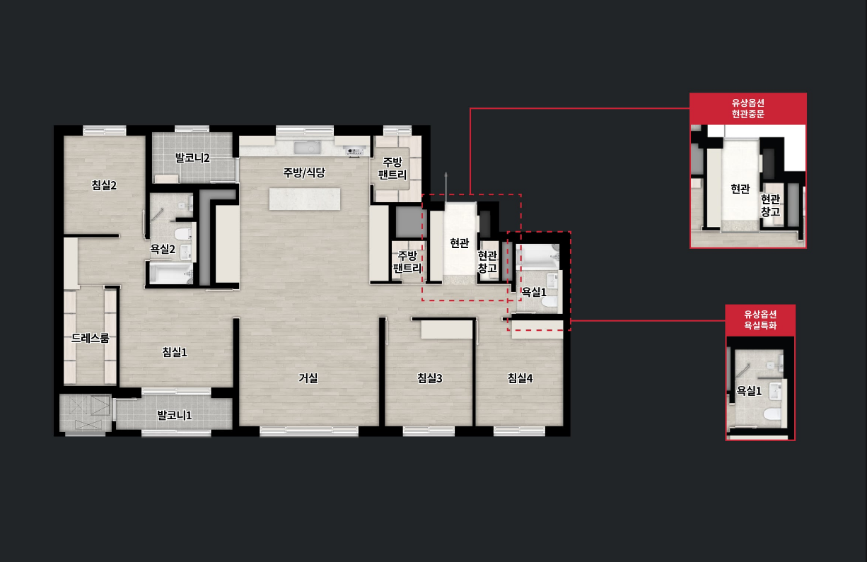 - 110㎡ 타입: 11자형 대면형 주방 설계로 요리 중에도 가족과 자연스럽게 소통할 수 있는 구조입니다. 대형 드레스룸과 넓은 팬트리 공간은 물론, 복도에도 수납공간을 추가하여 넉넉한 공간 활용을 제공합니다.