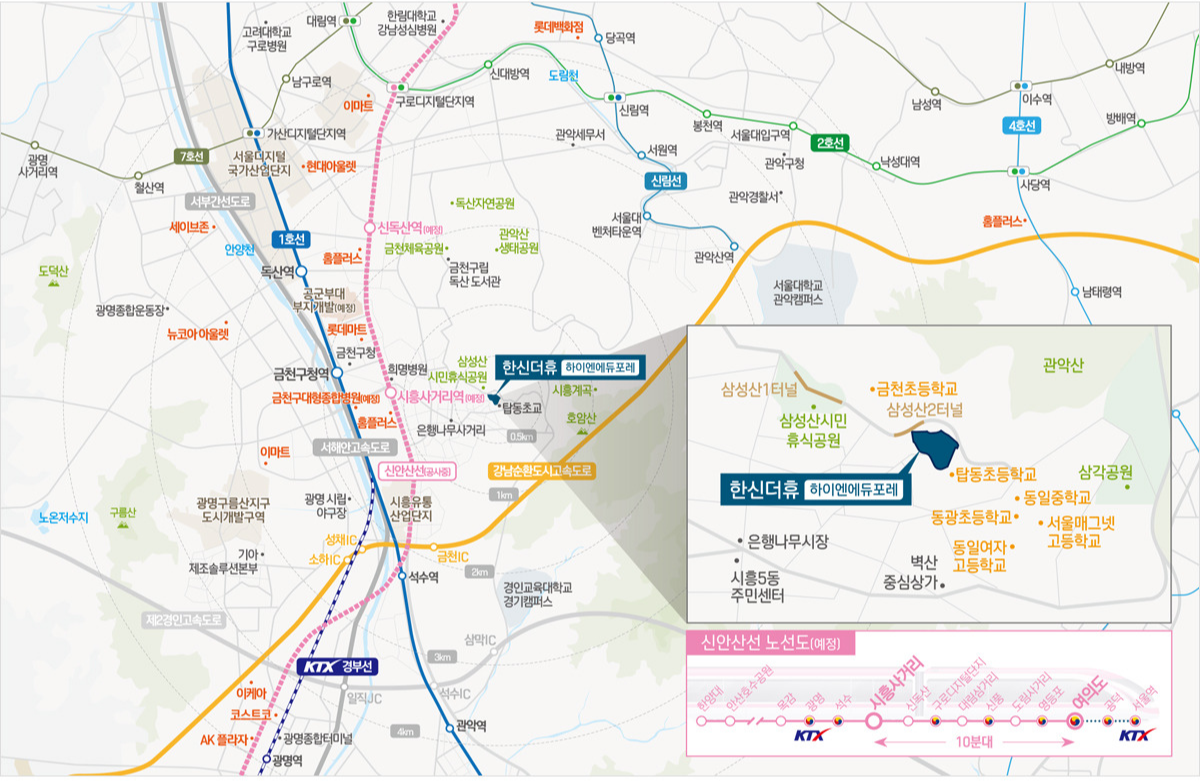 신안산선은 서울 서남권과 수도권 서부를 연결하는 철도 노선으로, 개통 시 금천구는 교통의 중심지로 급부상할 전망입니다. 한신더휴 하이엔에듀포레는 이 수혜를 온전히 누릴 단지로 평가됩니다.