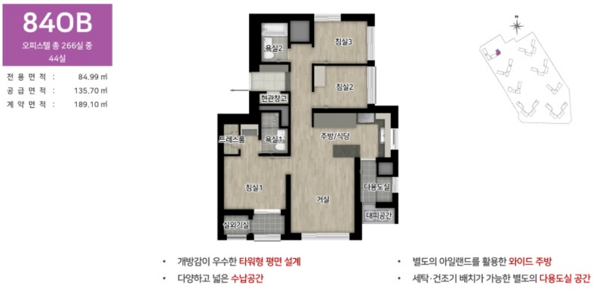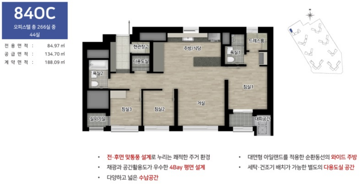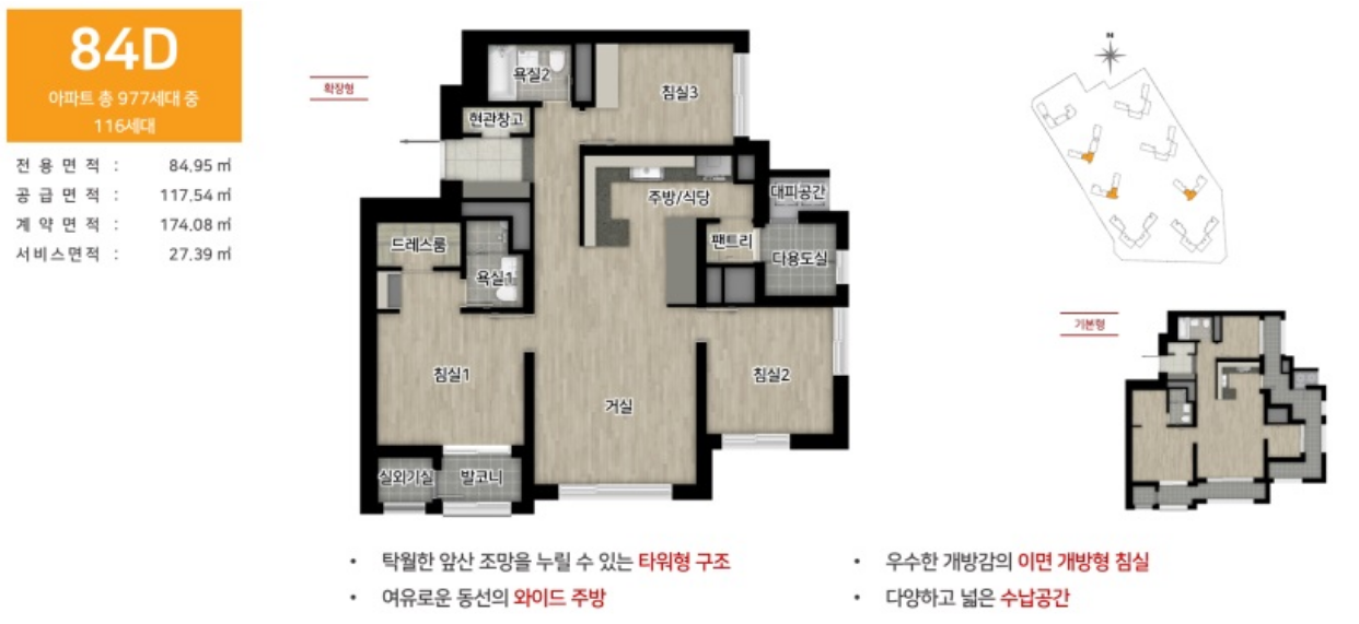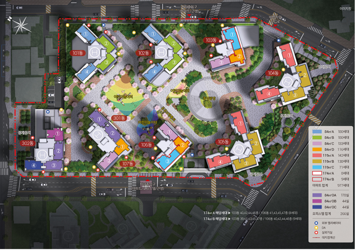 - 평형대: 아파트는 84㎡, 119㎡, 174㎡로 공급되며, 주거형 오피스텔은 84㎡로 구성