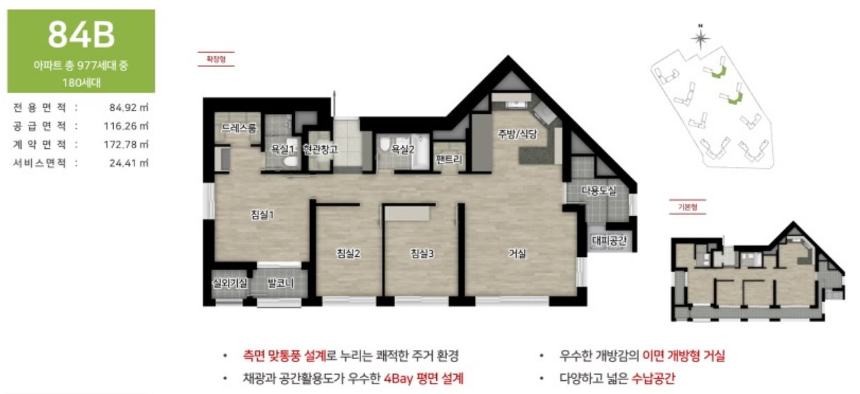 - 아파트 평형: 84㎡, 119㎡, 174㎡로 구성돼 있으며, 특히 84㎡ 타입은 실용적이고 공간 효율성이 높아 실수요자들 사이에서 인기가 높을 것으로 예상됩니다.