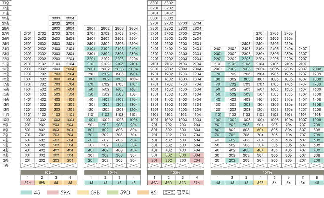 일반분양: 전용 45㎡(47세대), 59㎡A(3세대), 59㎡B(2세대), 59㎡D(3세대) ,65㎡(18세대)
