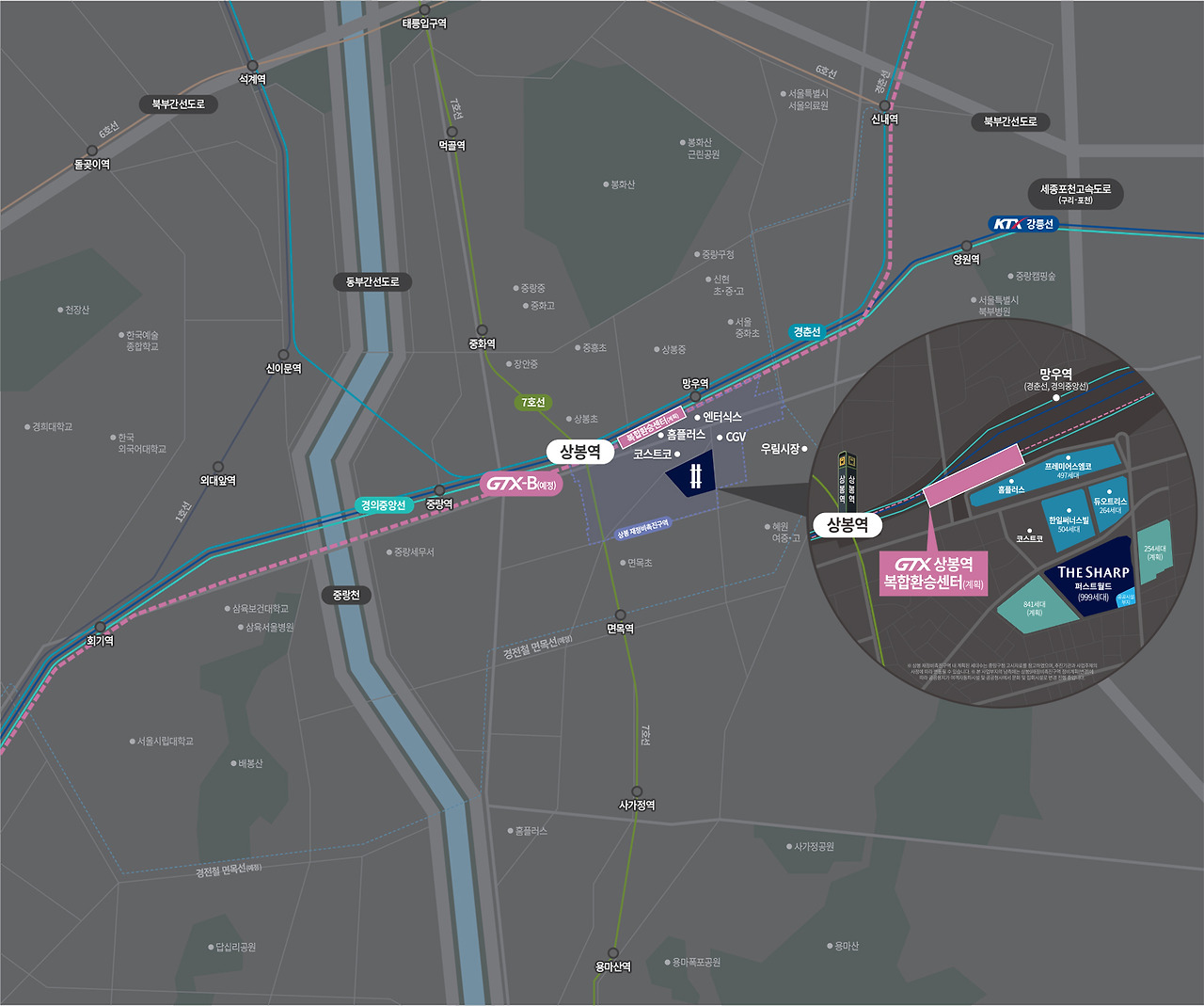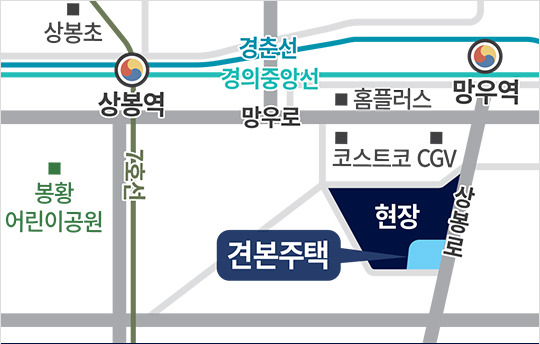 • 망우역, 상봉역 인접: 경춘선, 경의중앙선, 지하철 7호선, KTX, 그리고 예정된 GTX-B 노선 등 총 5개 노선을 이용할 수 있는 진정한 펜타역세권입니다.