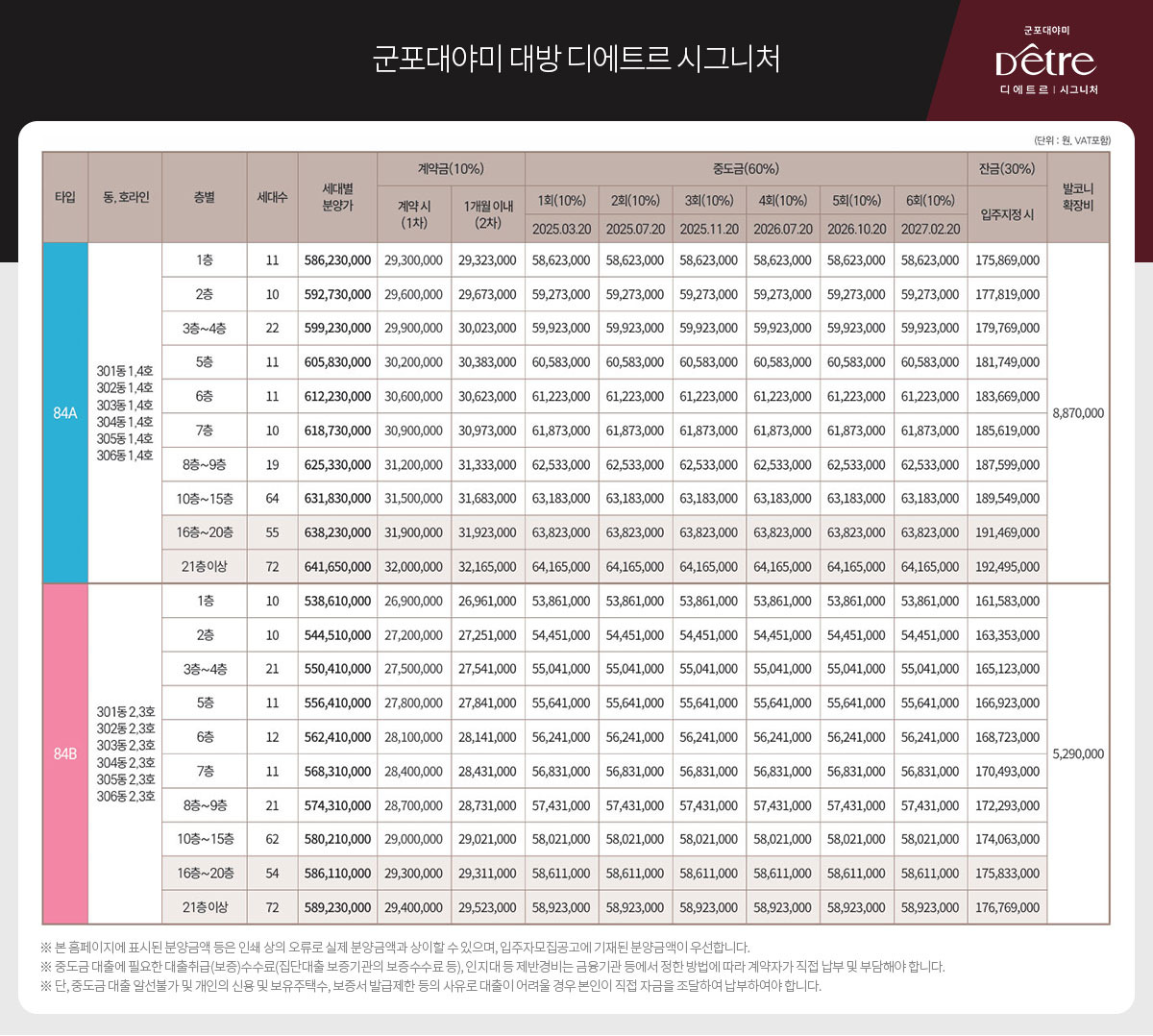 • 대야미 디에트르 시그니처 84㎡ 분양가: 약 5억 3,800만 원부터 시작
