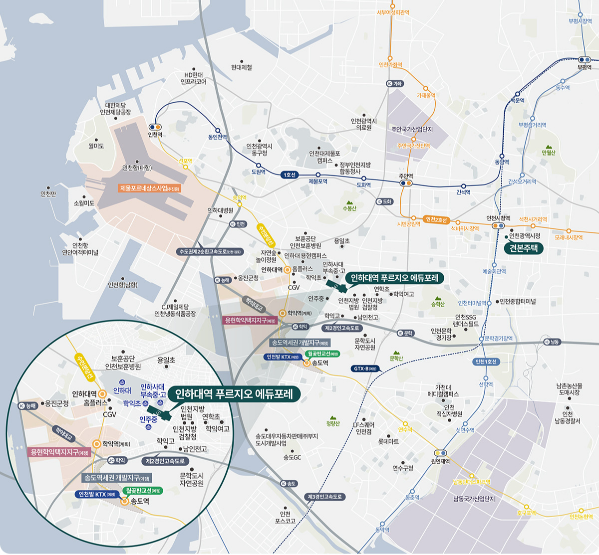 단지에서 가까운 수인분당선 인하대역은 수도권 남부와 서울로의 접근성을 높여줍니다. 추가로, GTX-B 노선이 인하대역과 연결될 예정이어서 향후 교통 여건은 더욱 개선될 것입니다.