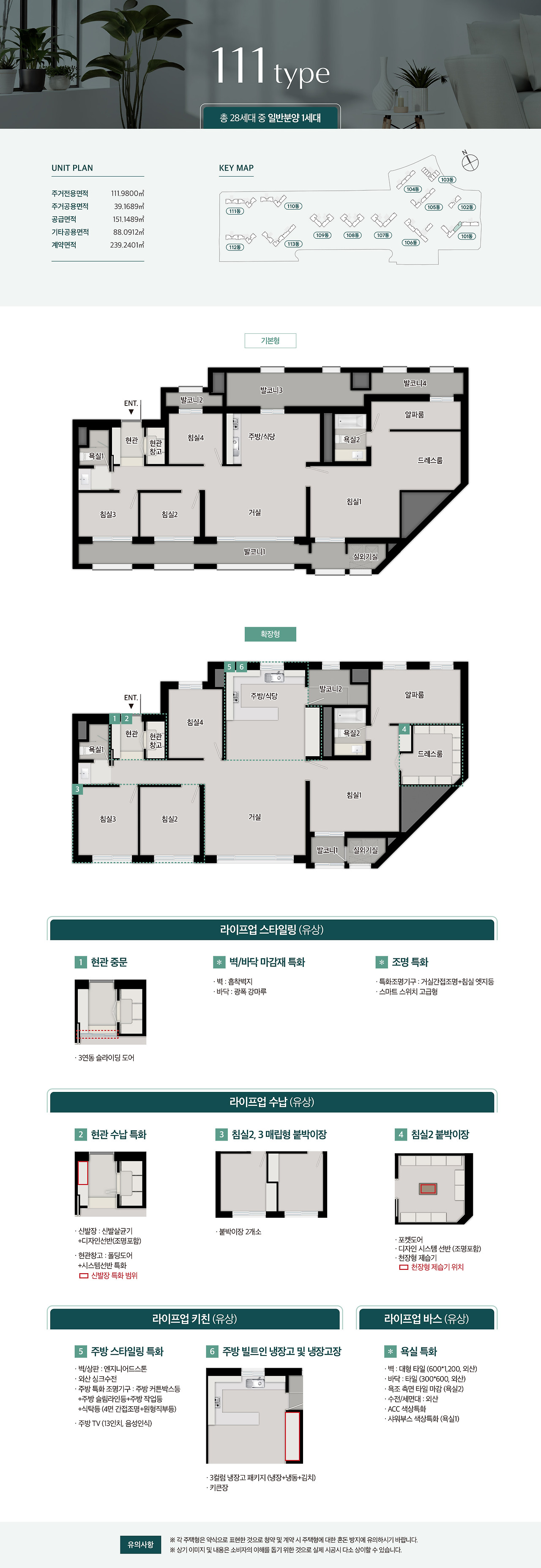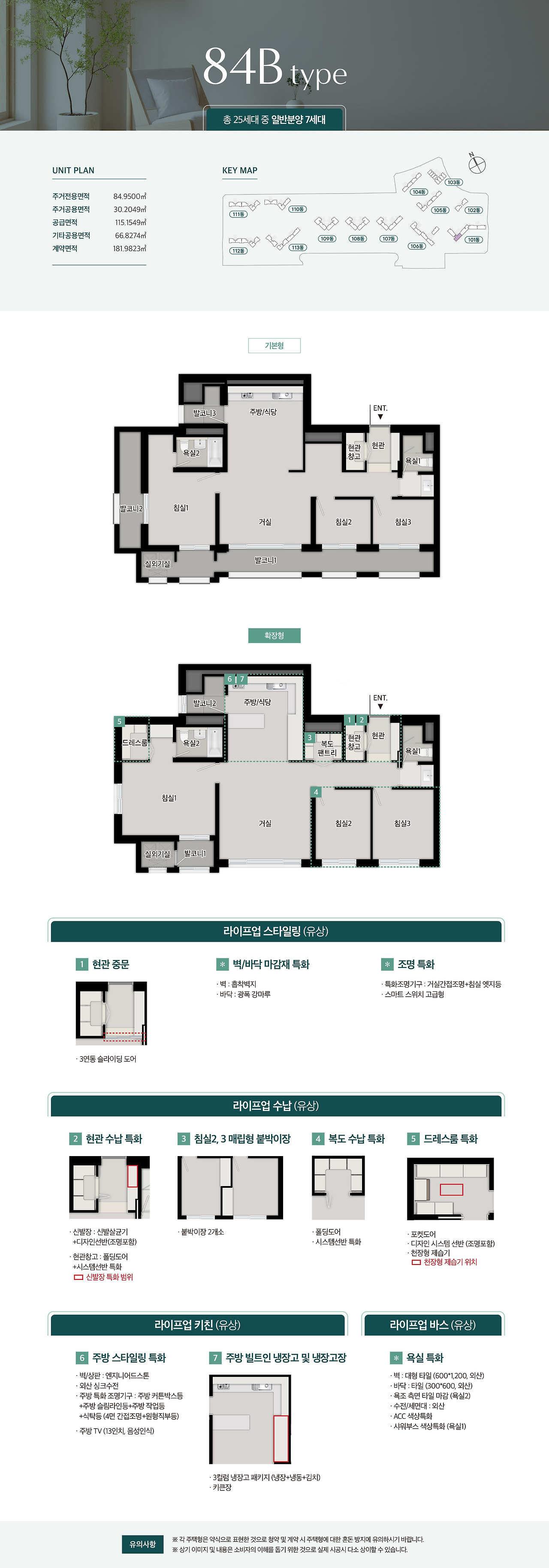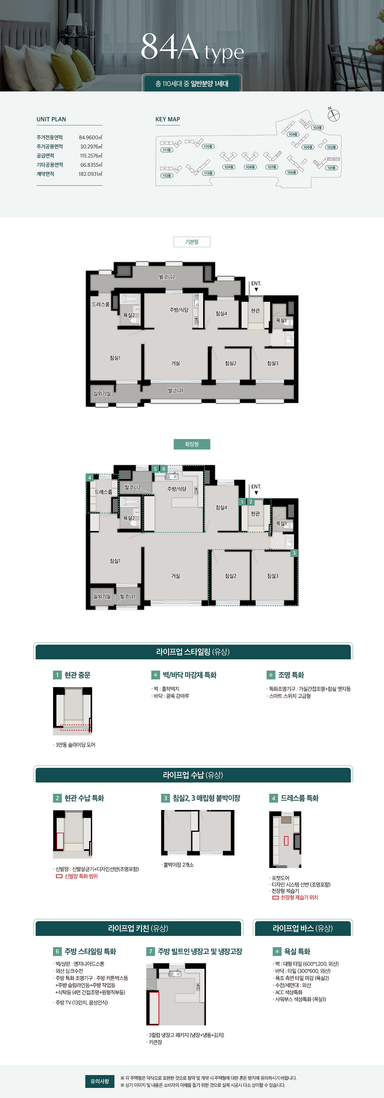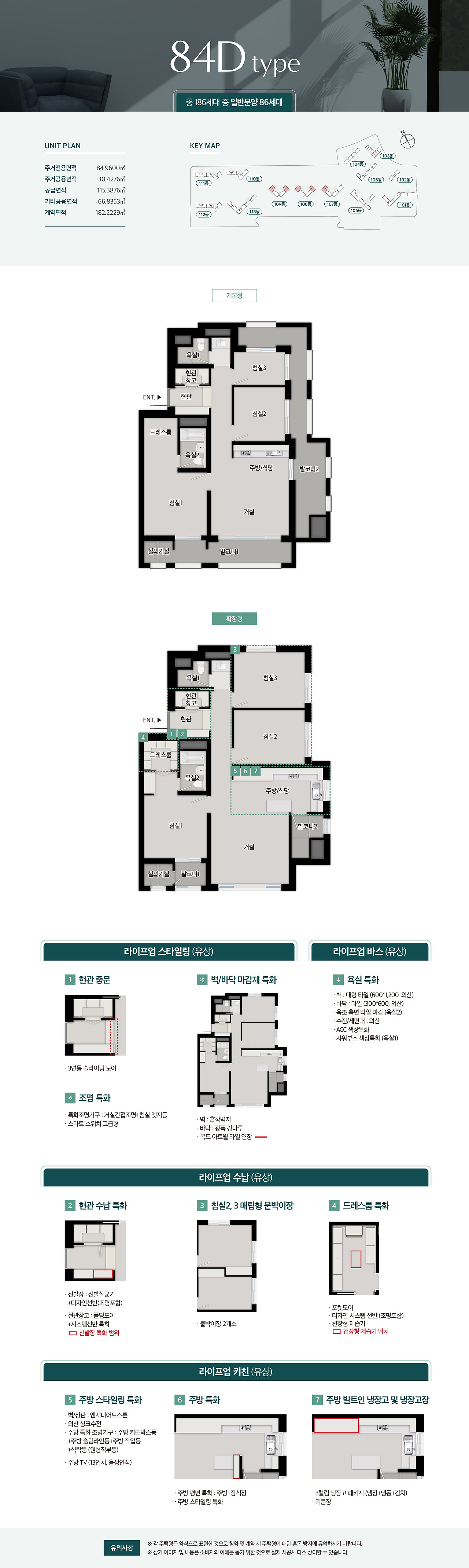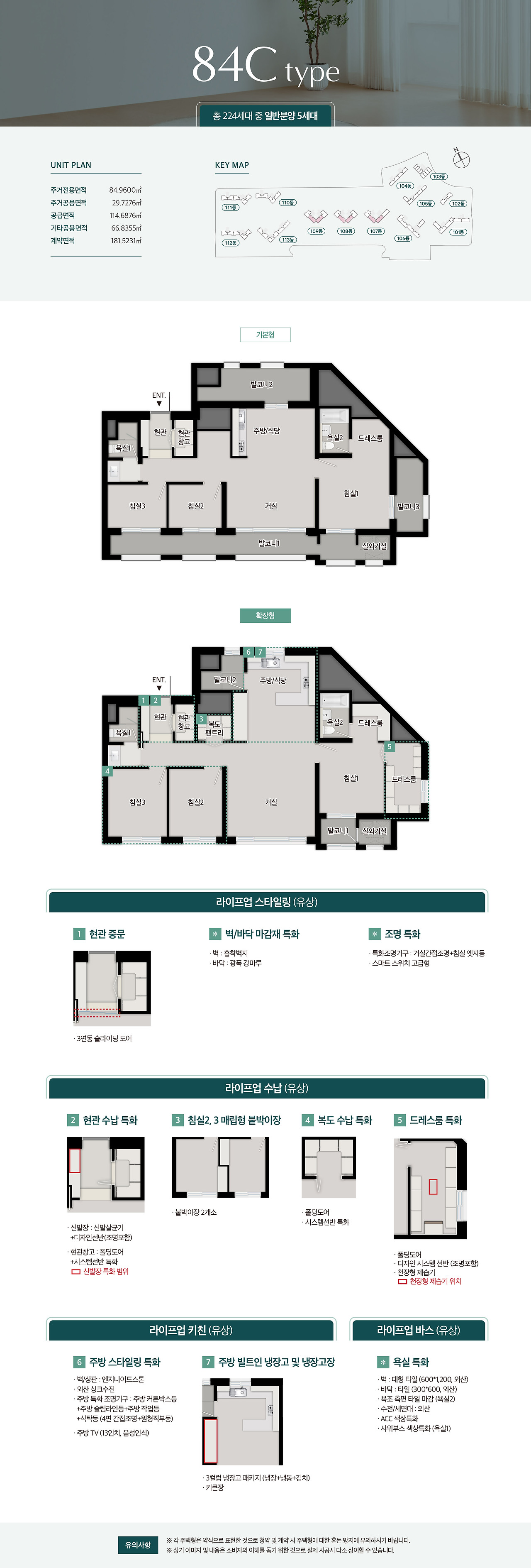 - 84㎡ 타입: 4인 가족에게 적합한 설계, 방 3개와 넓은 거실