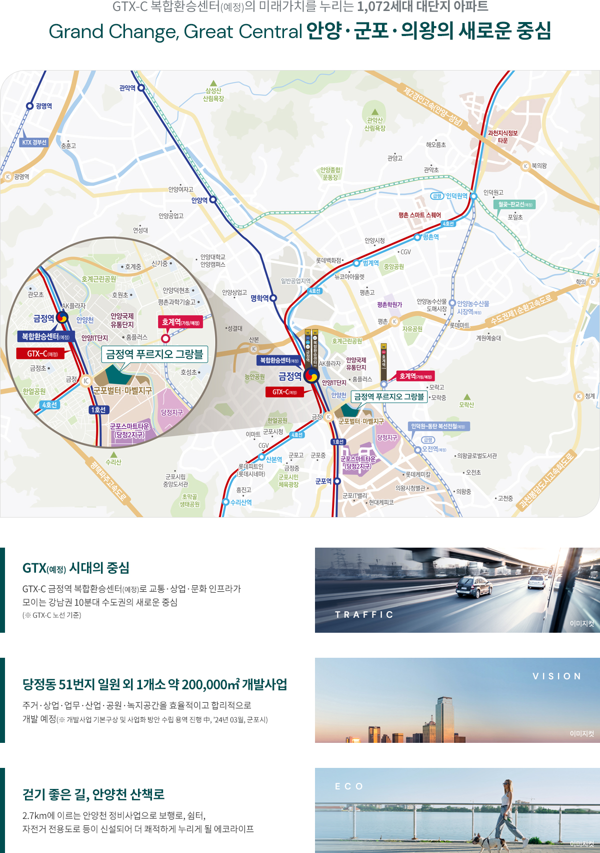 - GTX-C 노선 예정: 금정역에 GTX-C 노선이 추가로 확정되면서 서울 삼성역 및 수서역과 연결되어 서울 도심 접근성이 더욱 강화될 예정입니다. 향후 입주 시점에는 GTX 수혜로 인해 서울과 강남 접근성이 크게 개선되어 주거 가치를 높일 중요한 요소가 될 것입니다.