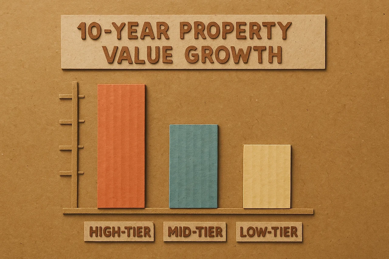 - 상급지 (서울 강남·서초, 일부 마포·용산 등): 10년간 2.5~3배 상승