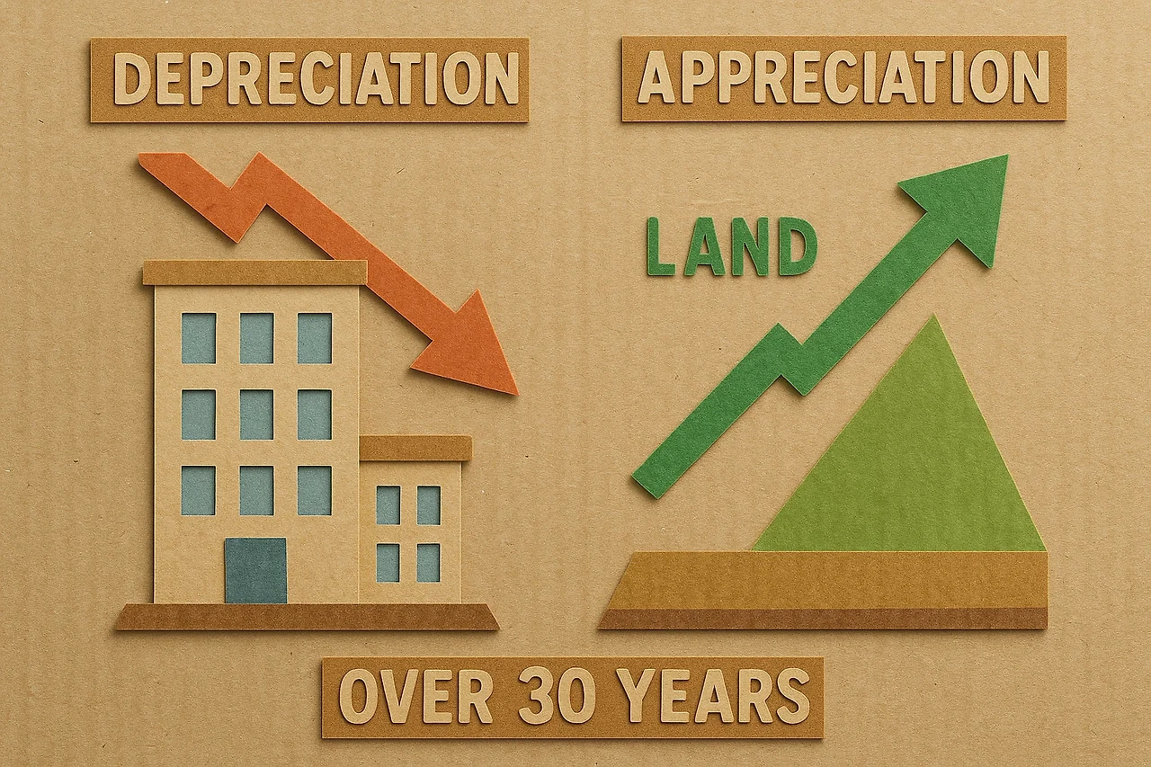건물은 시간이 지나며 구조적 열화, 설비 노후, 디자인 구시대화 등으로 인해 가치가 감소합니다. 통상 연 3% 감가상각률을 적용할 경우, 30년 경과 시 '건물 가치'는 사실상 사라집니다. 반면 토지는 시간이 지날수록 위치, 희소성, 지역 개발 등에 따라 가격이 상승하는 속성을 지닙니다. 결국 장기적으로는 ‘토지를 사고 있는가’가 시세 흐름을 좌우합니다. - 신축의 프리미엄 침식