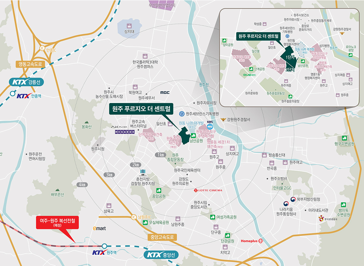 원주 푸르지오 더 센트럴은 원주시 원동에 위치해 원주 도심 및 주변 생활권과의 접근성이 뛰어납니다. 특히 원주는 강원 지역에서 유망한 중소도시로, 향후 다양한 교통 개발 계획이 예정되어 있습니다. 가장 주목받는 교통 호재는 중부내륙고속철도입니다. 이 철도가 완공되면 원주에서 서울 강남까지 약 1시간 대로 접근이 가능해져 수도권 통근 수요까지 아우를 수 있을 것으로 기대됩니다.