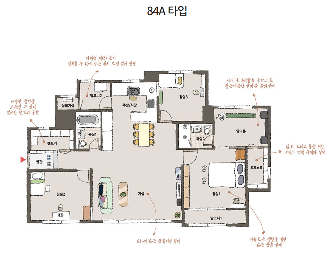 의왕고천지구 대방 디에트르 센트럴은 84㎡로 전 세대가 동일한 면적을 갖추고 있으나, A, B, C 세 가지 평형으로 나누어 다양한 선택지를 제공합니다. 84A형은 거실과 주방이 효율적으로 연결된 구조로, 가족들이 함께 시간을 보낼 수 있는 넓은 공간을 제공합니다. 84B형은 추가적인 수납 공간과 자연 채광을 최적화한 설계가 특징입니다. 84C형은 각 방의 독립성을 강화한 구조로 프라이버시를 중시하는 입주자에게 적합한 선택이 될 수 있습니다.