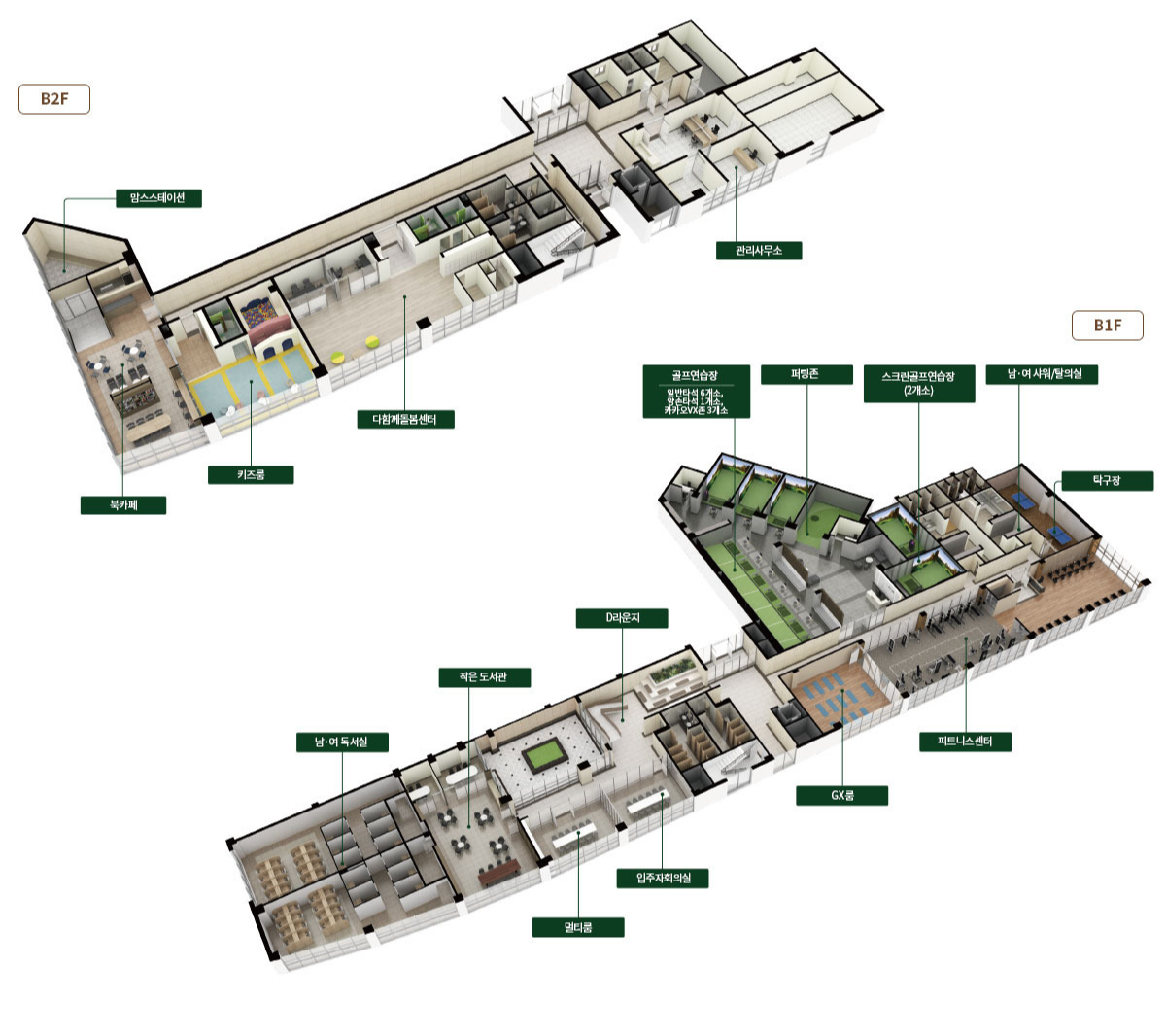 - 피트니스 센터, 독서실, 어린이 놀이시설 등 다채로운 시설 제공.