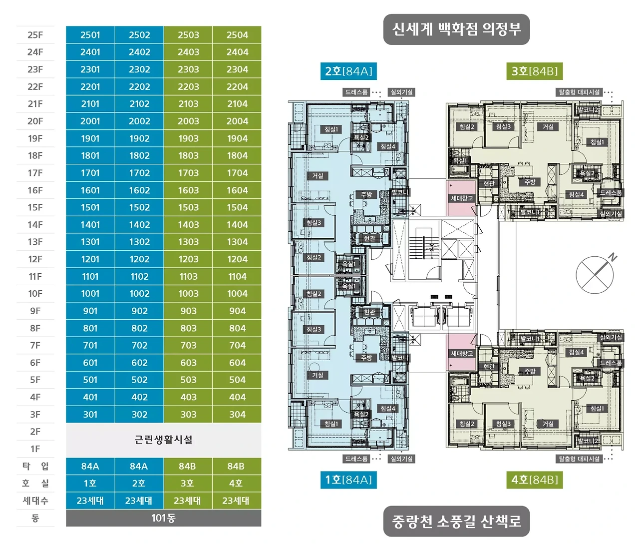 의정부역 다채로움은 총 92세대로 구성된 1개 동 아파트로, 지하 4층부터 지상 25층까지 이루어져 있습니다. 모든 세대는 실용성과 공간 활용성을 극대화한 전용 84㎡로 구성되었으며, 타입별로 A형과 B형으로 나뉘어 각기 다른 매력을 제공합니다.