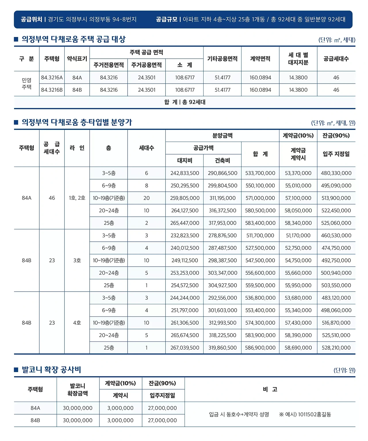 - 총 세대수: 92세대 (전용면적 84㎡ A형 46세대, B형 46세대)