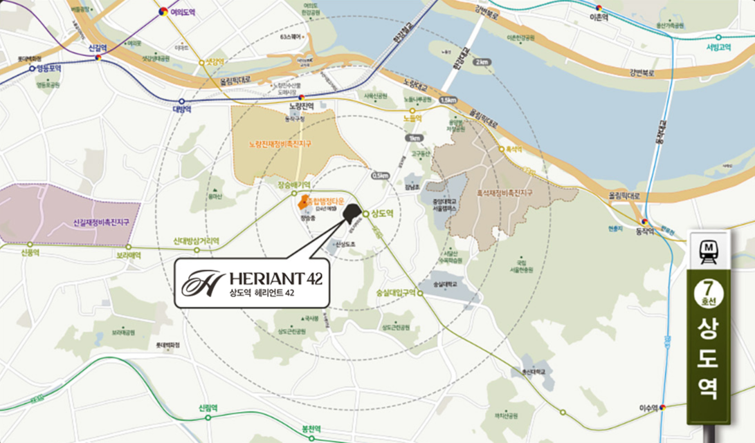 상도역 헤리언트42는 지하철 7호선 상도역 초역세권으로, 단지와 지하철역이 직결되는 최상의 접근성을 제공합니다. 초역세권이라는 위치적 이점은 출퇴근이 편리하고, 시간 절약 효과가 커 주거 선호도가 높은 요소입니다. 특히 강남, 여의도, 구로디지털단지 등 서울 주요 업무지구로의 이동이 간편해 직주근접의 장점이 부각됩니다.